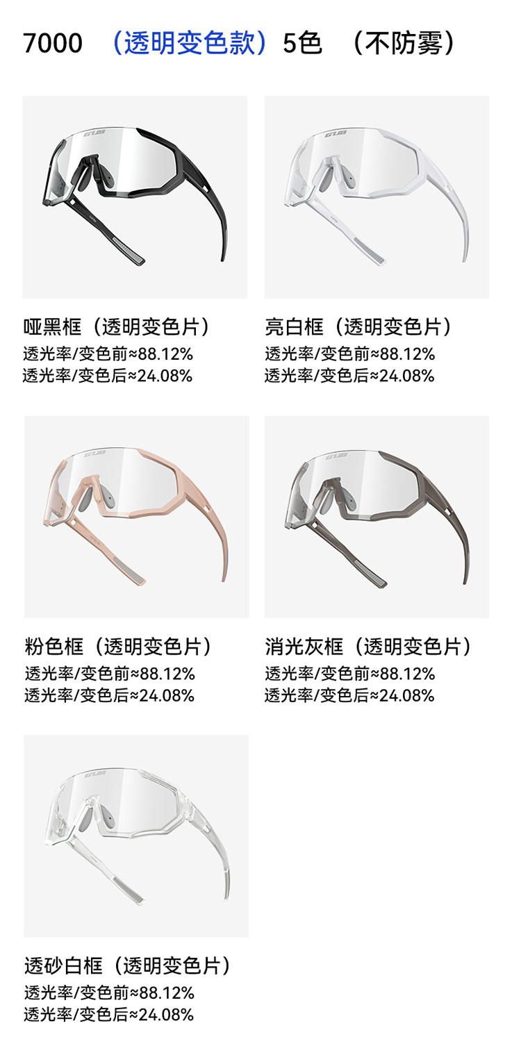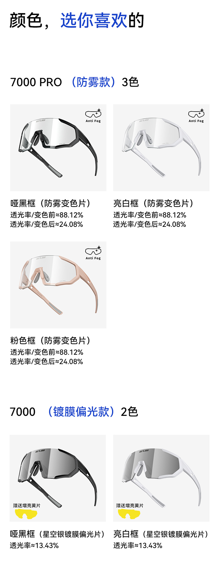 颜色:哑黑/透明变色片、亮白/透明变色片、樱花粉/透明变色片、消光灰银/透明变色片、透砂白/透明变色片、水晶灰/透明变色片、哑黑/星空银偏光片、亮白/星空银偏光片、亮白/渐进粉变色片、亮白/渐进蓝变色片、哑黑/渐进粉变色片