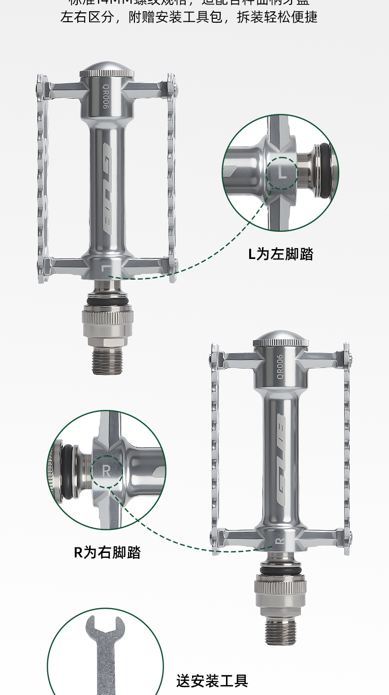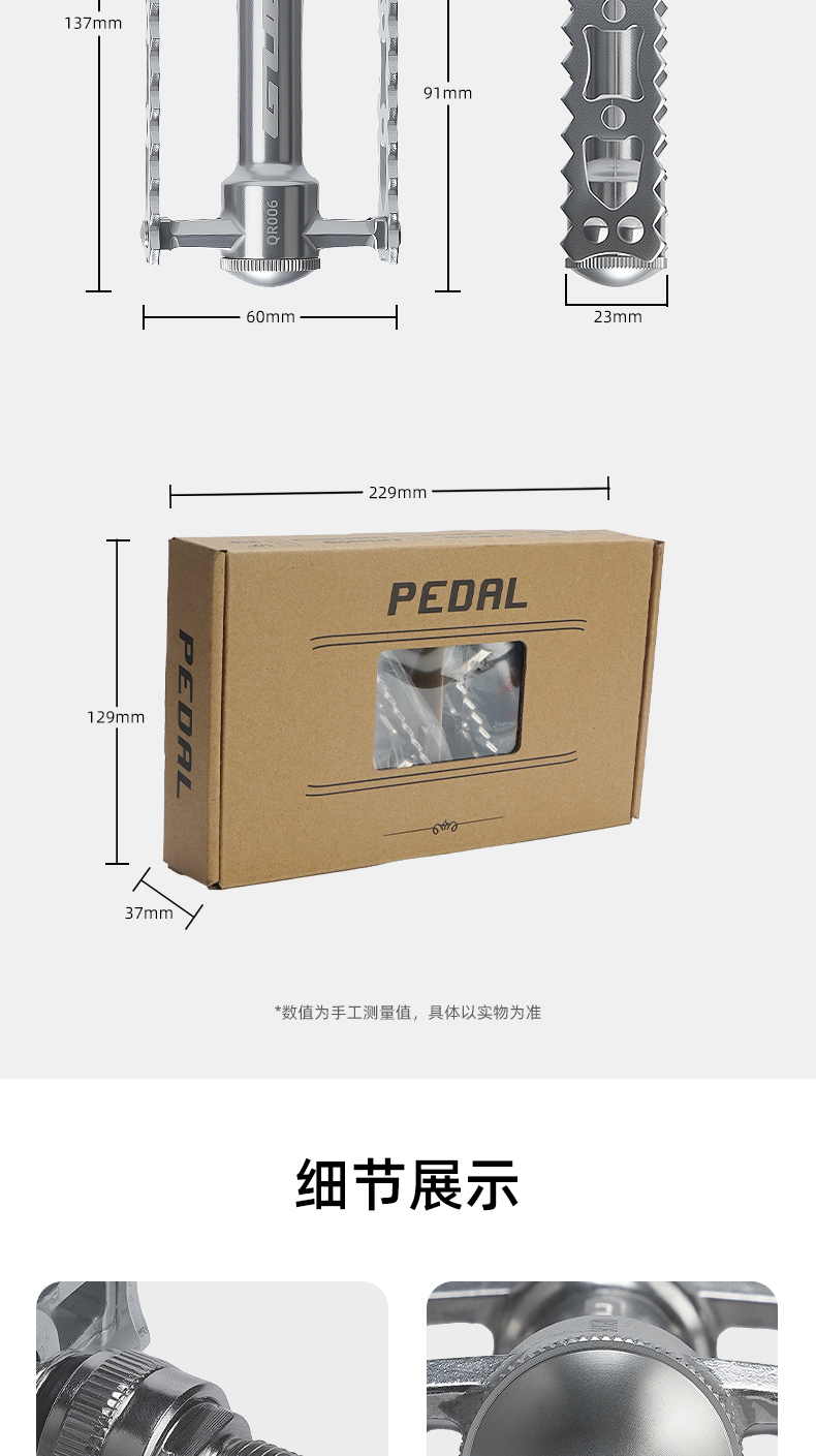 重量:双快拆净重约380克/对,毛重约456克 ;左快拆右螺纹脚踏净重约340克/对,毛重约438克