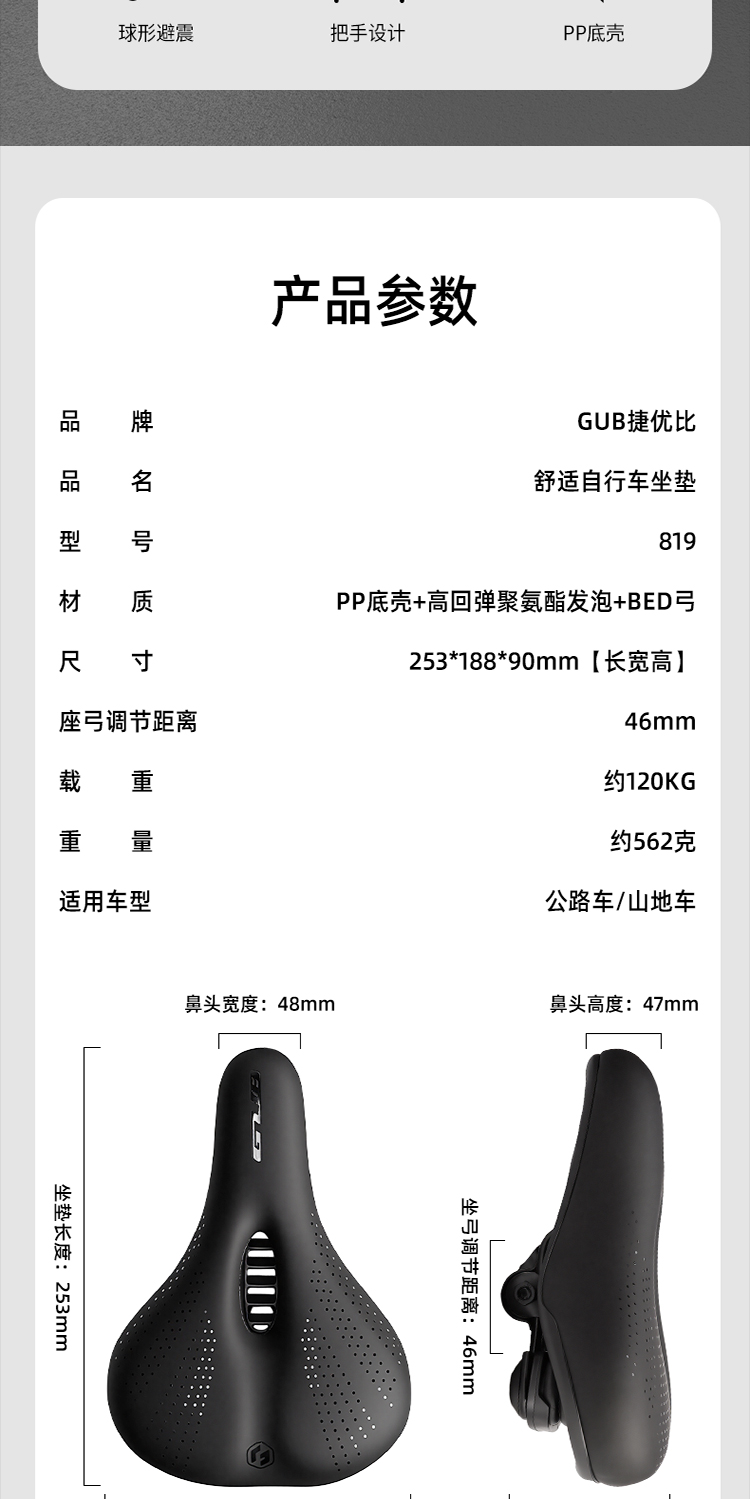 材质:PP底壳+高回弹聚氨酯发泡+BED弓