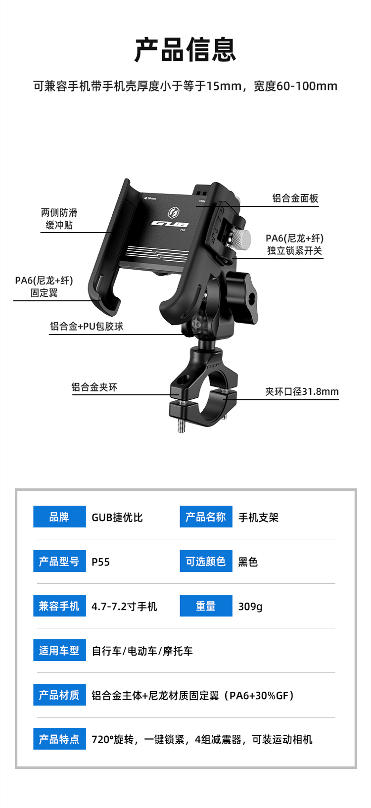 名称:GUB P55 避震款手机支架