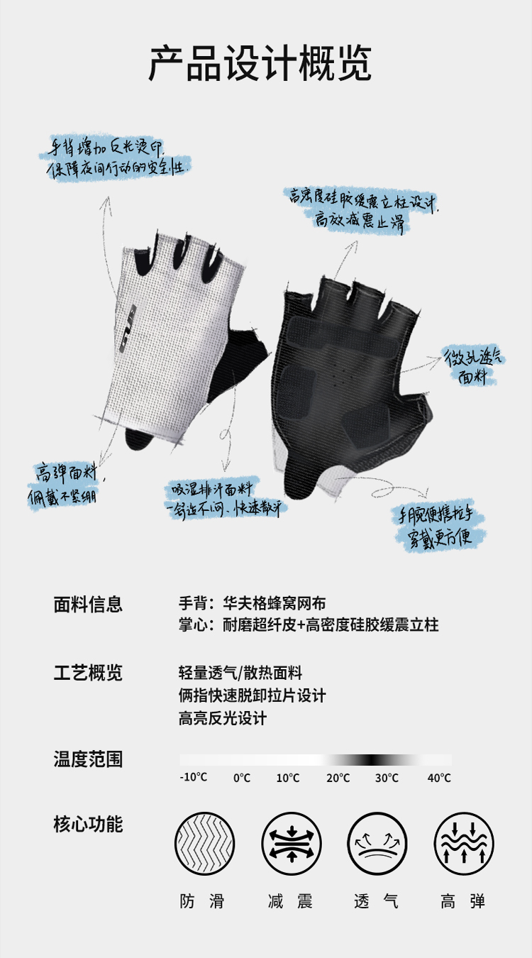 材质:手背华夫格提花面料、掌面耐磨防滑超纤、高密度硅胶缓震立柱、中指/无名指快脱指袢设计、手腕便携拉手穿戴更方便